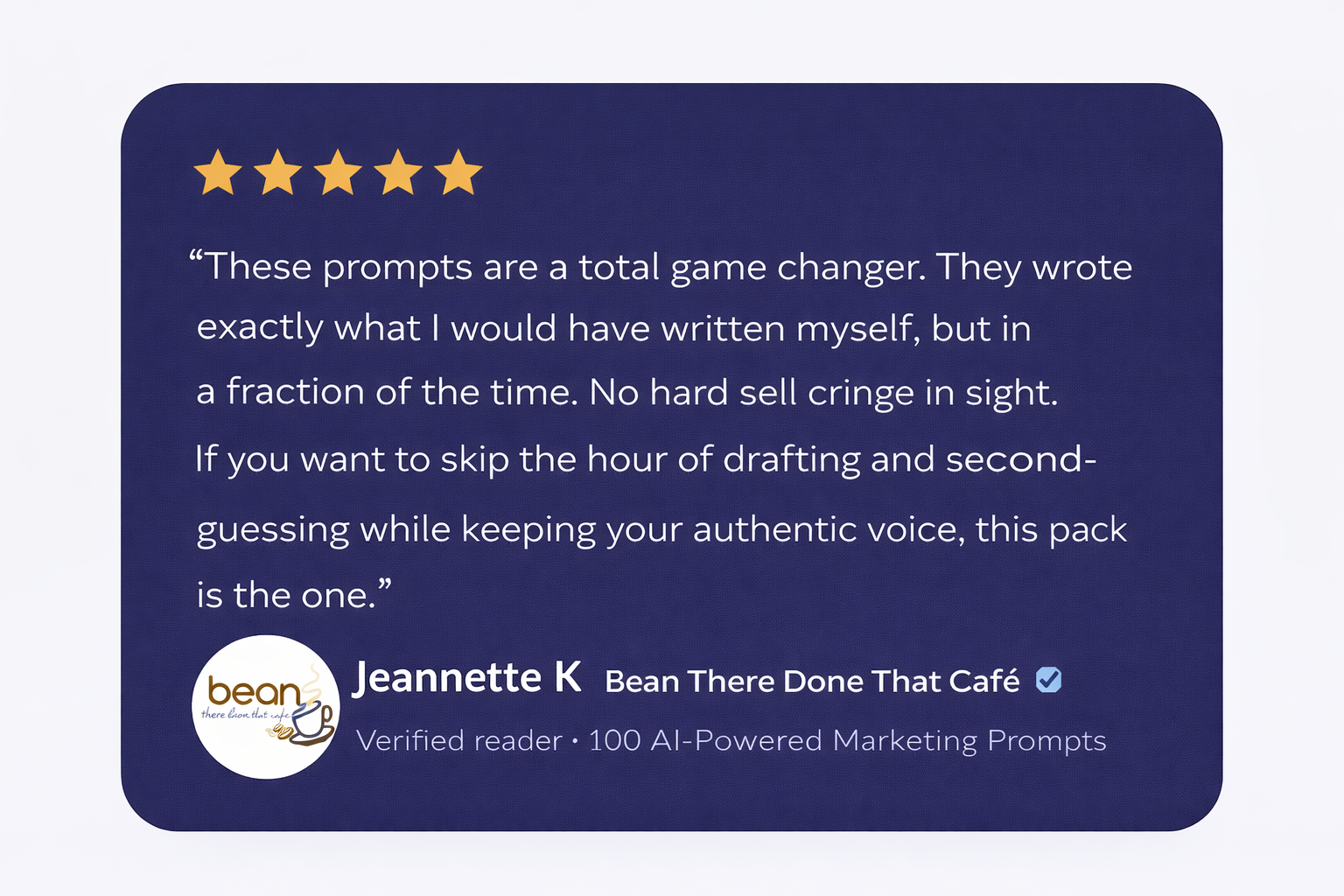 This pack gives you 100 plug-and-play AI marketing prompts that turn ChatGPT, Claude or Gemini into your personal content machine. Even if you don’t feel creative, inspired or remotely in the mood.