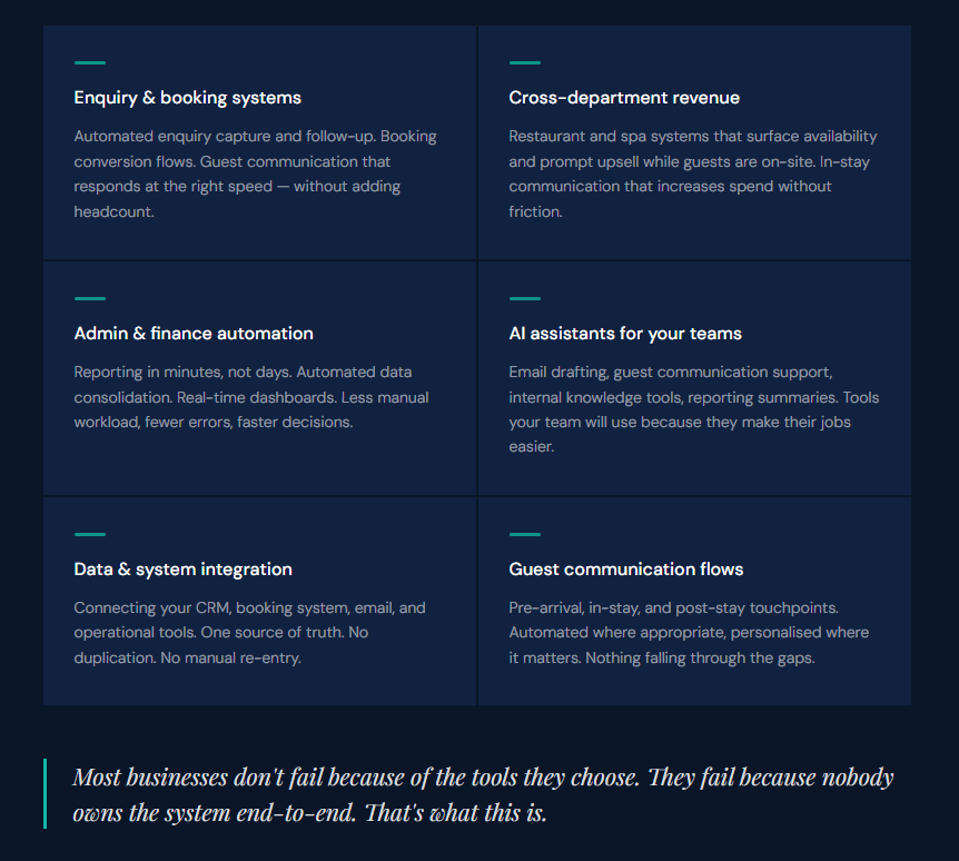 Implementation is led by me directly. Every system is aligned with your commercial goals, your team's capabilities, and the specific findings from your audit.